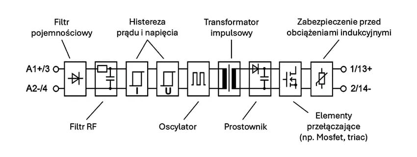 Na poniższym schemacie widać szereg filtrów, które mają za zadanie niwelować wpływ zakłóceń na działanie przekaźnika. Na środku znajduje się transformator impulsowy. Jego główną funkcją jest transmisja sygnału z części pierwotnej do części wykonawczej, a ponadto zapewnienie izolacji galwanicznej na poziomie 4,6 kV AC.